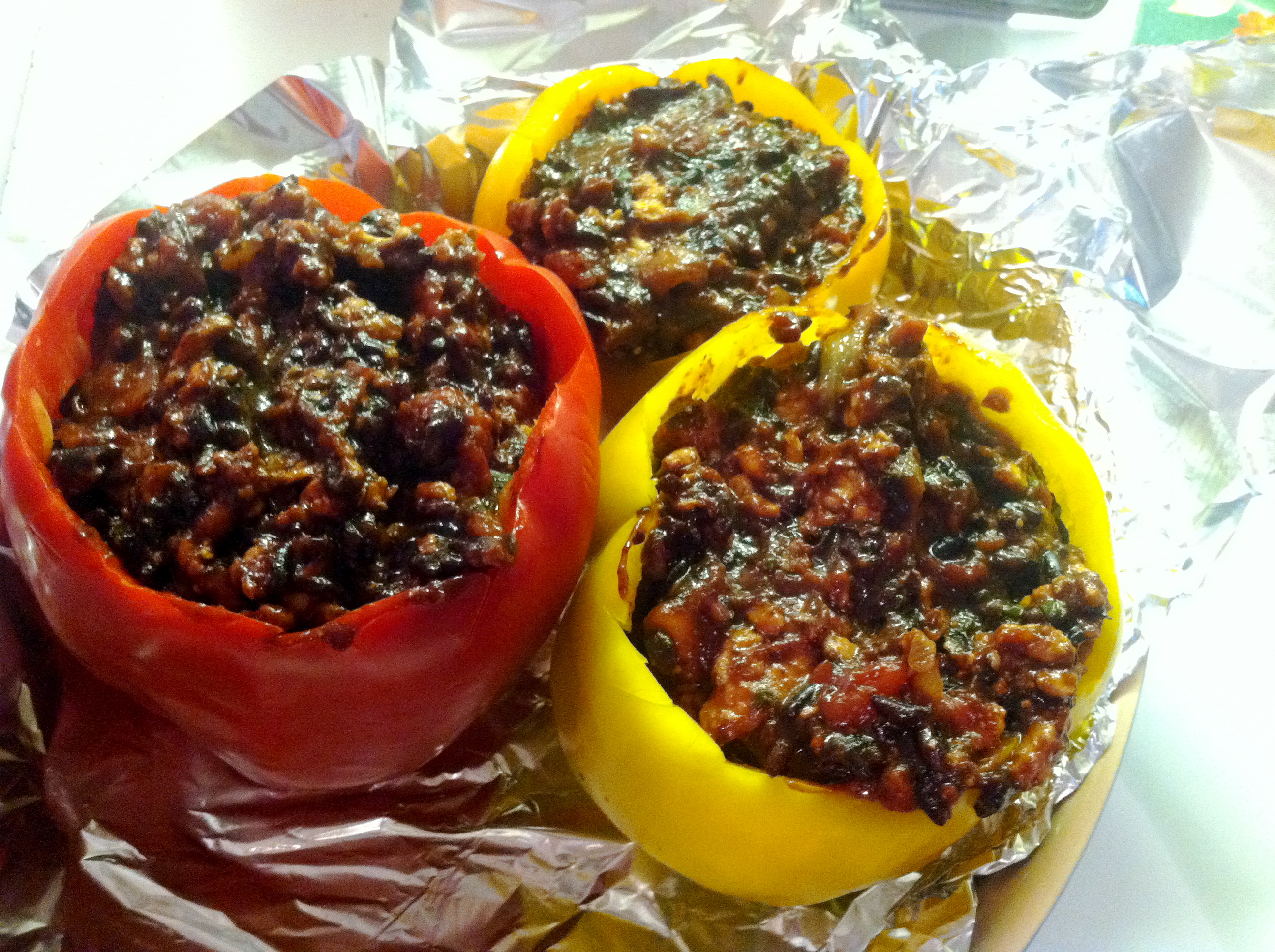 Stuffed bell pepper trio with ground turkey, black rice, cilantro and bourbon