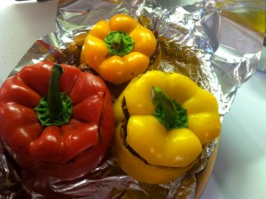 Stuffed bell pepper trio with ground turkey, black rice, cilantro and bourbon
